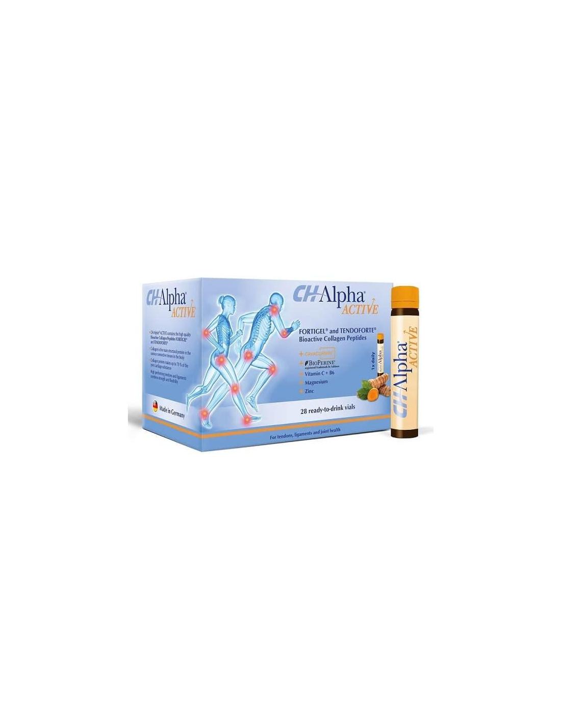 Supliment alimentar Colagen CH Alpha Active, 28 fiole buvabile, Gelita pentru sanatatea tendoanelor, ligamentelor si articulatiilor, în flacoane de 30 ml și cu o aromă de piersici.