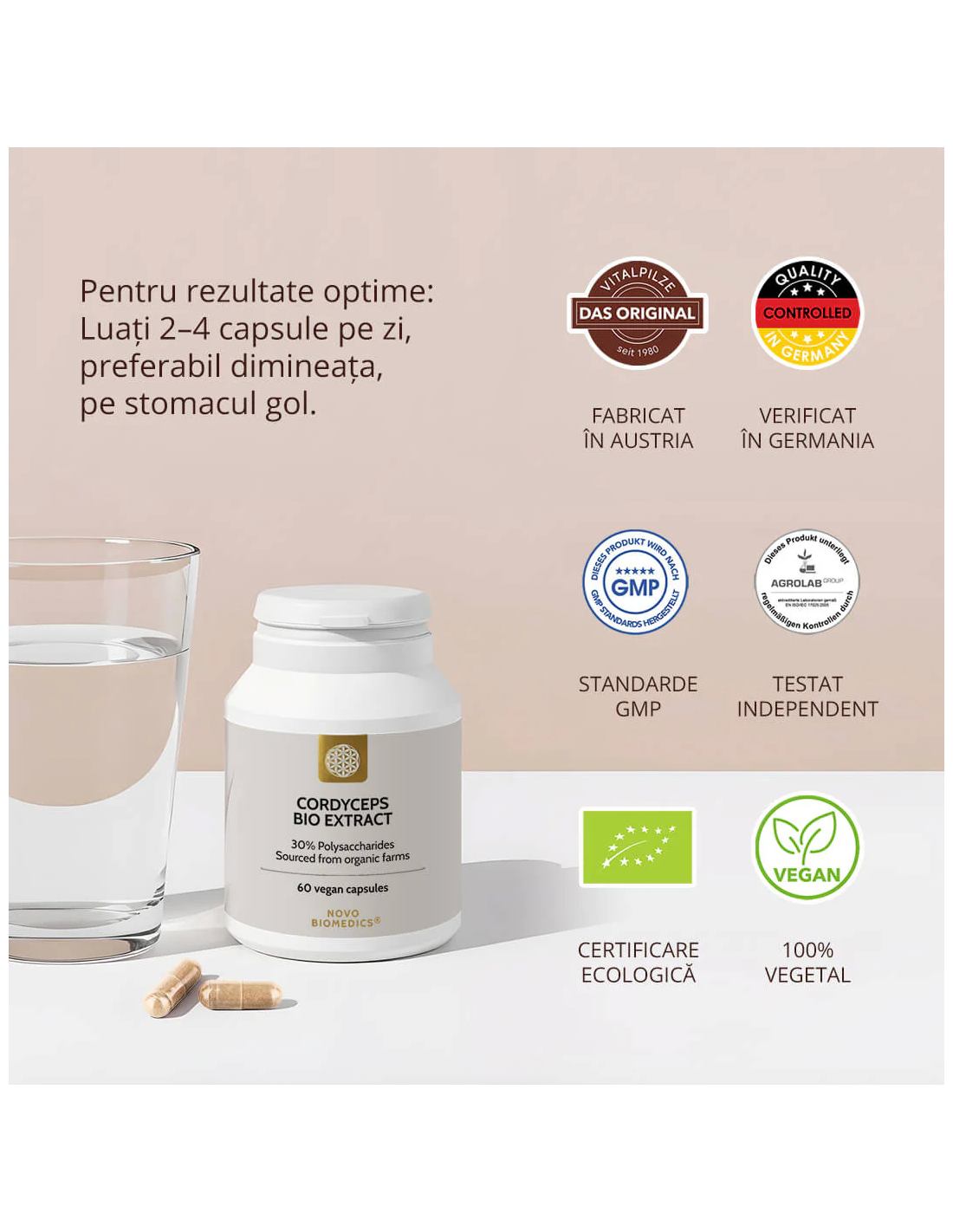 - Fără pulberi din miceliu sau ciuperci măcinate – doar extract activ, concentrat