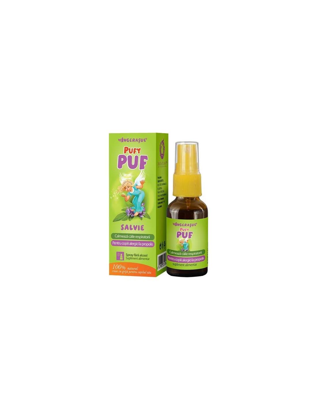Produsul Spray cu Salvie PufyPUF, 20 ml, Dacia Plant este usor de administrat fiind recomandat copiilor alergici la propolis, calmeaza caile respiratorii.