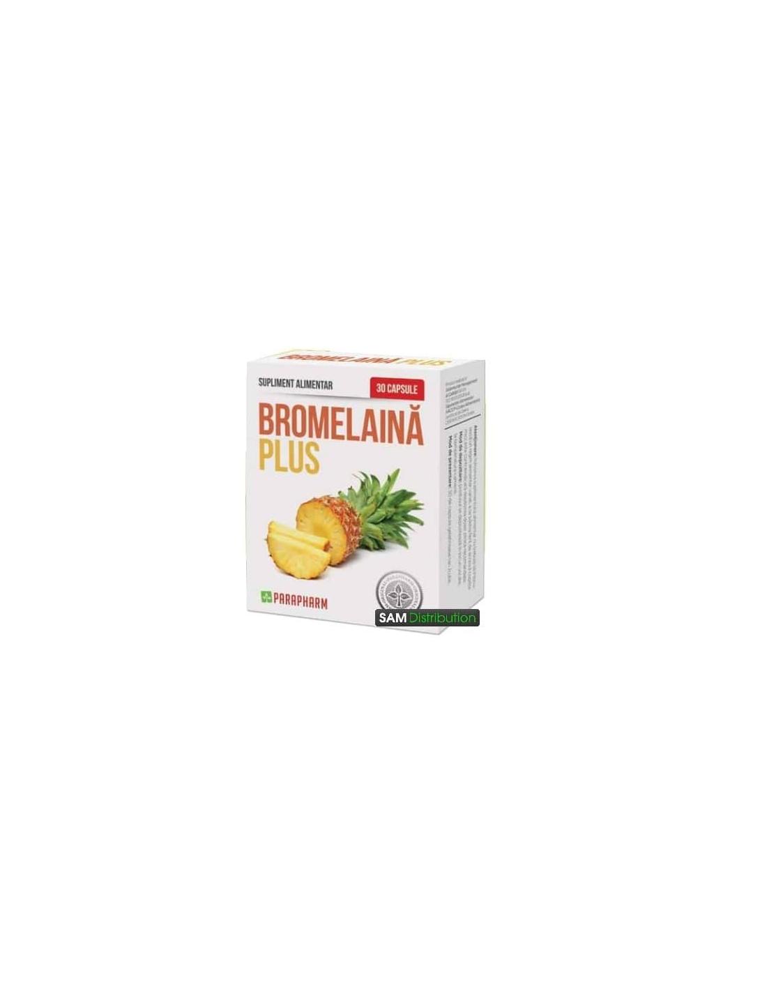Suplimentul Bromelaina Plus conţine Bromelaină naturală extrasă din tulpina plantei de ananas (Ananas comosus) cu activitate enzimatică de 2500 GDU/g și vitamina B6.