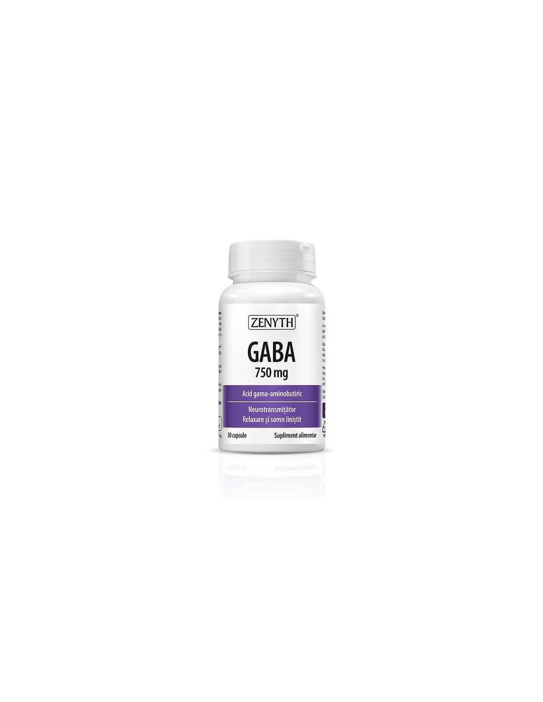 Supliment alimentar Gaba 750mg Zenyth (Acid gama-aminobutiric) ce reduce stresul, susține relaxarea și stimulează somnul. GABA sub formă de supliment alimentar are capacitatea de a îmbunătăți relaxarea, diminuând stările de anxietate, depresie, stres, tulburările hiperkinetice.