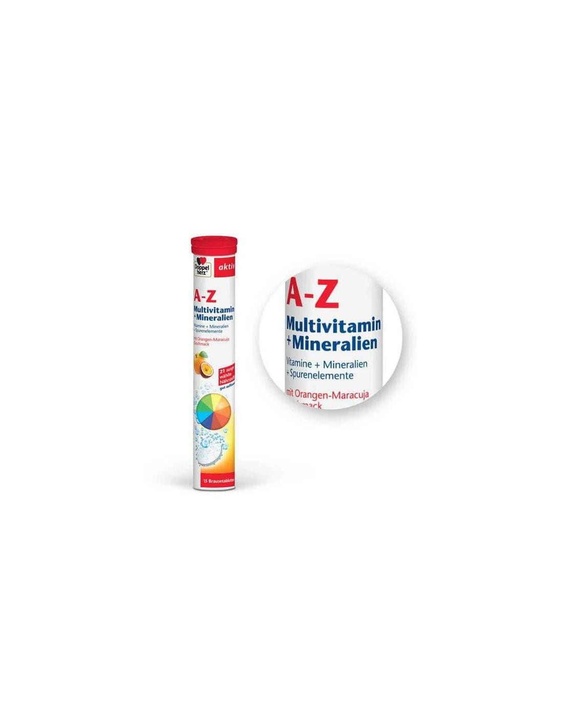 Produsul A-Z Vitamine Minerale Microelemente Doppelherz are in compozitia sa 21 de vitamine, oligoelemente si minerale, de la vitamina A, la zinc. Aceste vitamine de la Doppelherz sprijina sanatatea organismului si starea de bine, avand forma unor comprimate efervescente, solubile, cu un gust foarte bun de maracuja si portocale.