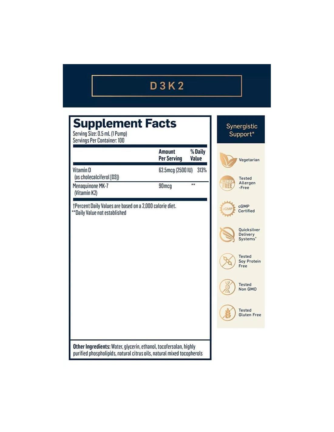 - Vitamina D3+K2 Lipozomală QuickSilver ajută la susținerea oaselor puternice, a imunității, a bunei dispoziții și a sănătății arteriale.