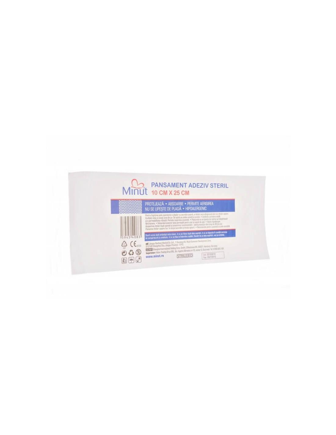 Pansament adeziv steril, Minut 10 cm x 25 cm, non-aderent, permeabil pentru apa si aer; Invelis: material netesut cu marginile rotunjite; Adeziv: poliarcrilat noniritant, bine tolerat de tegument.Protejeaza, absoarbe, permite aerisirea, nu se lipeste de plaga, nu se dezlipeste de piele. Ambalat individual. Steril.