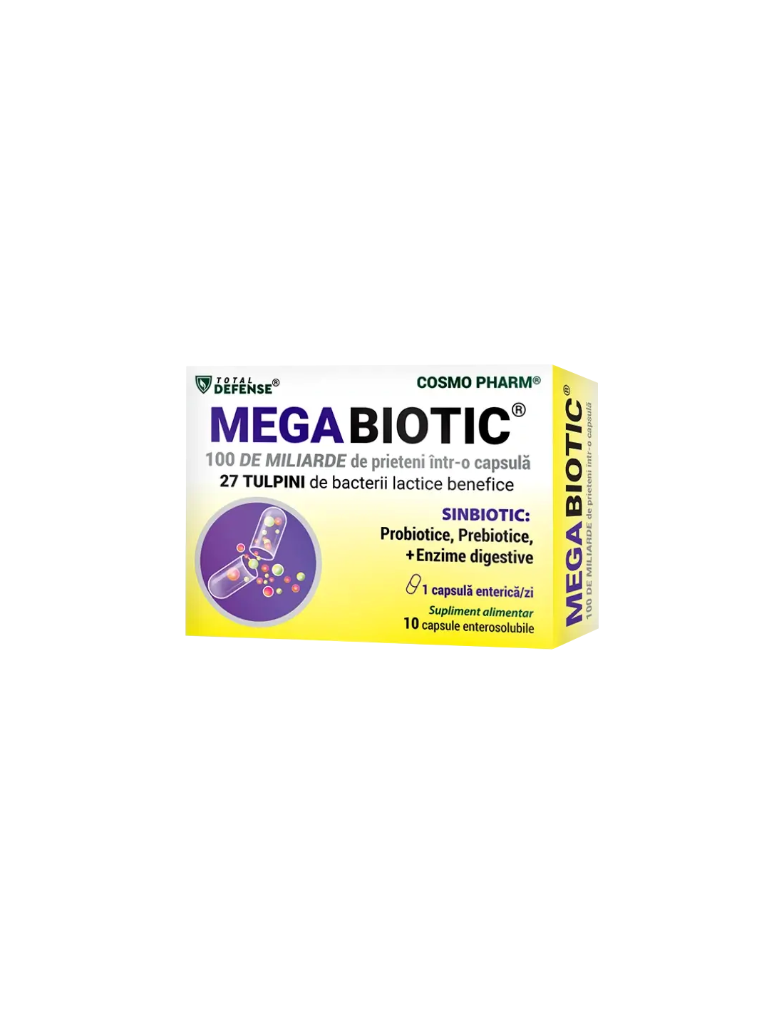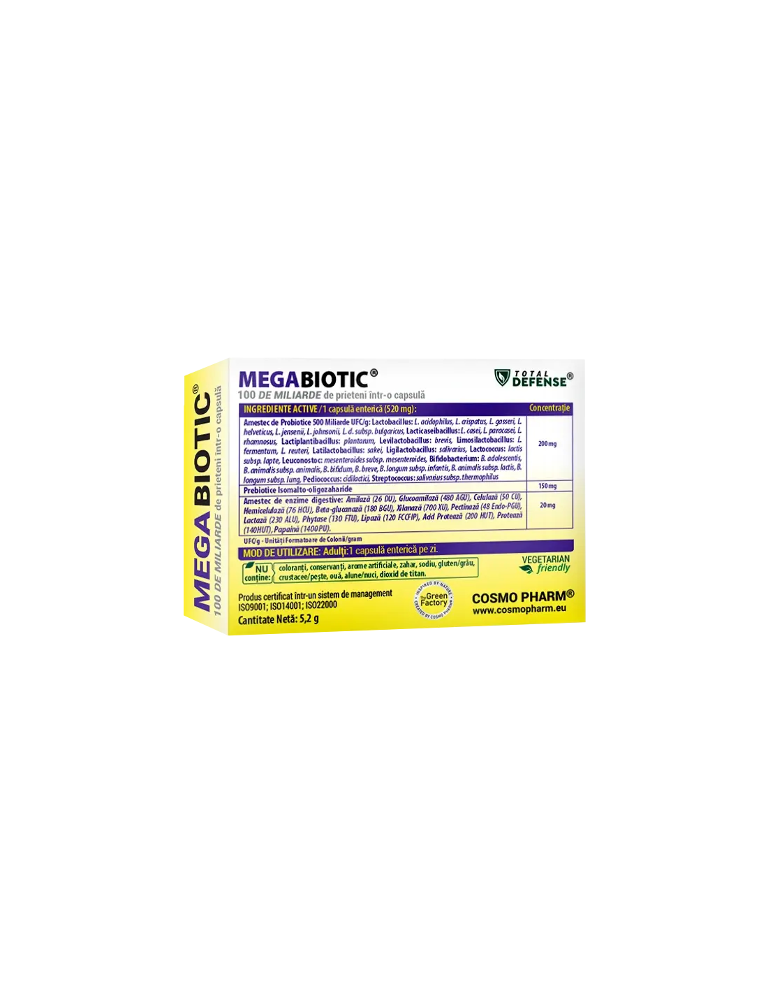 MEGABIOTIC – Sinbiotic cu spectru larg: 100 miliarde UFC probiotice, prebiotice si enzime digestive într-o singură capsulă cu eliberare controlată, pentru sanatatea digestiva.