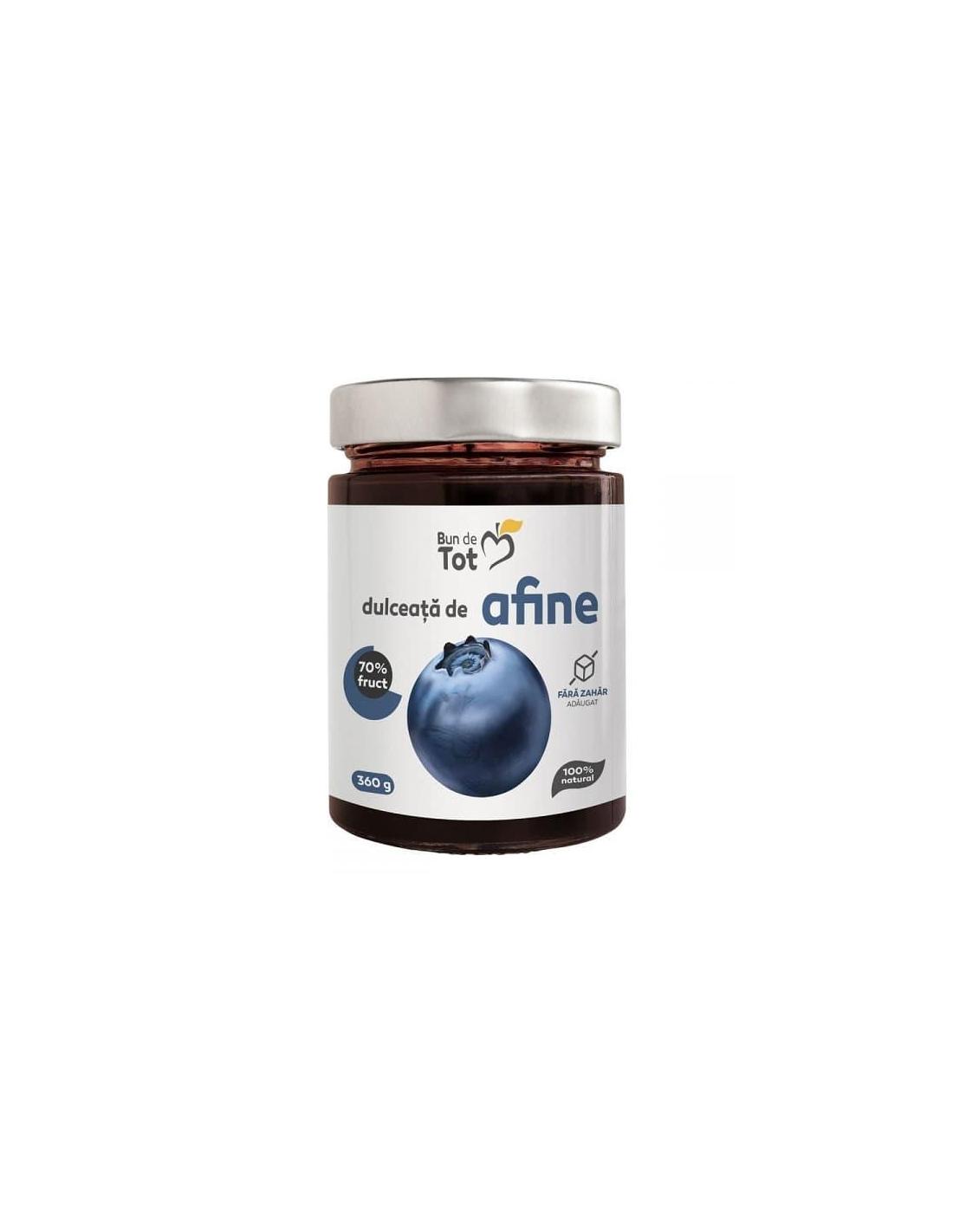 Dulceata de Afine, 360gr, Dacia Plant - fara zahar ce readuce la viata reteta veritabila. Contine ingrediente 100% naturale si readuce pe papilele gustative ale consumatorului savoarea autentica si inconfundabila a afinelor. Intr-o cantitate de 100 de grame a produsului nostru se regasesc 70 de grame de fruct. Atunci cand sunteti in cautarea unei gustari usoare intre mesele principale, un desert delicios sau un mic dejun sanatos, dulceata de affine Bun de Tot e exact ceea ce aveti nevoie.