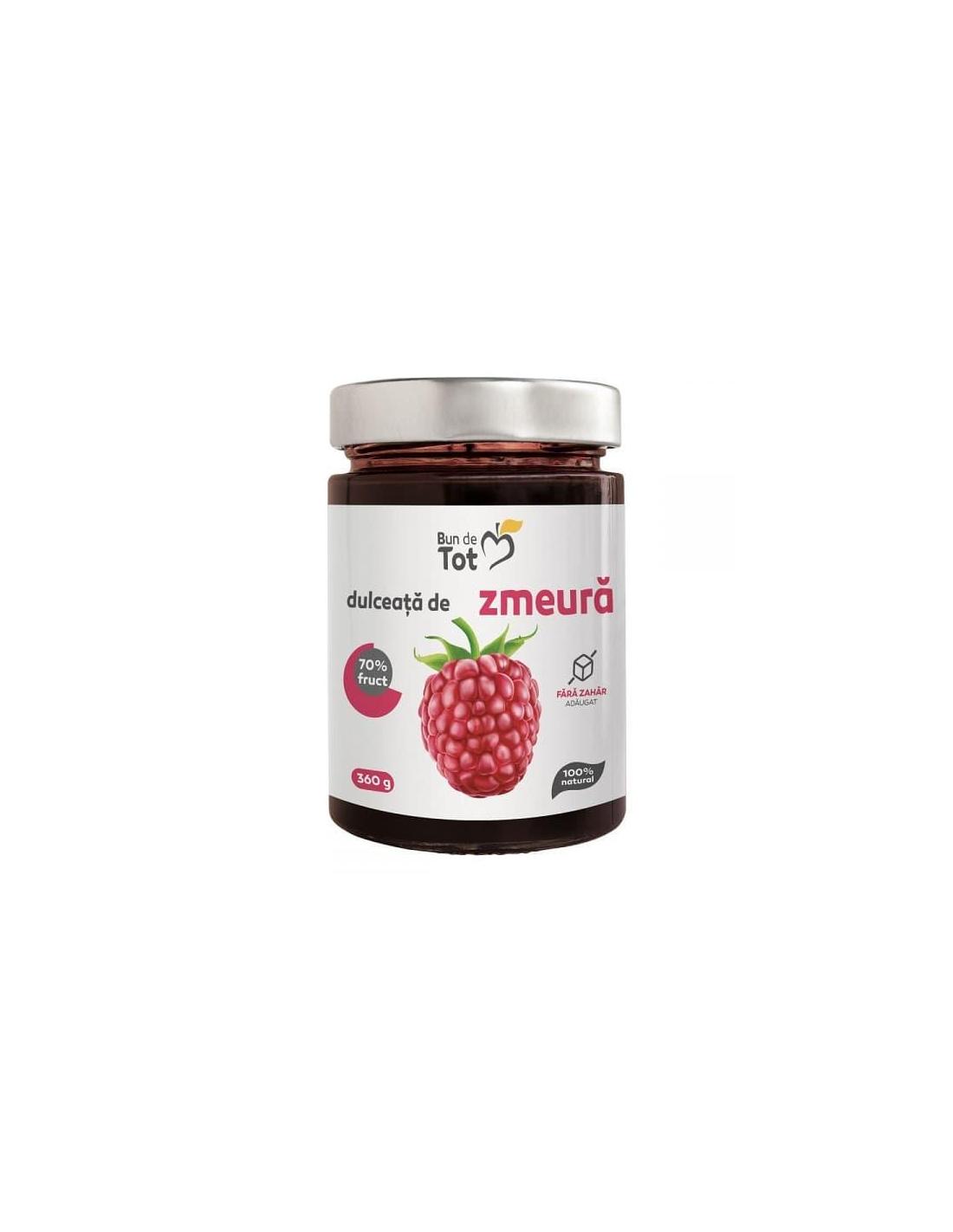 Dulceata de Zmeura, 360gr, Dacia Plant - fara zahar readuce la viata reteta veritabila. Contine ingrediente 100% naturale si readuce pe papilele gustative ale consumatorului savoarea autentica si inconfundabila a zmeurei. Intr-o cantitate de 100 de grame a produsului nostru se regasesc 70 de grame de fruct. Atunci cand sunteti in cautarea unei gustari usoare intre mesele principale, un desert delicios sau un mic dejun sanatos, dulceata de zmeura Bun de Tot e exact ceea ce aveti nevoie.
