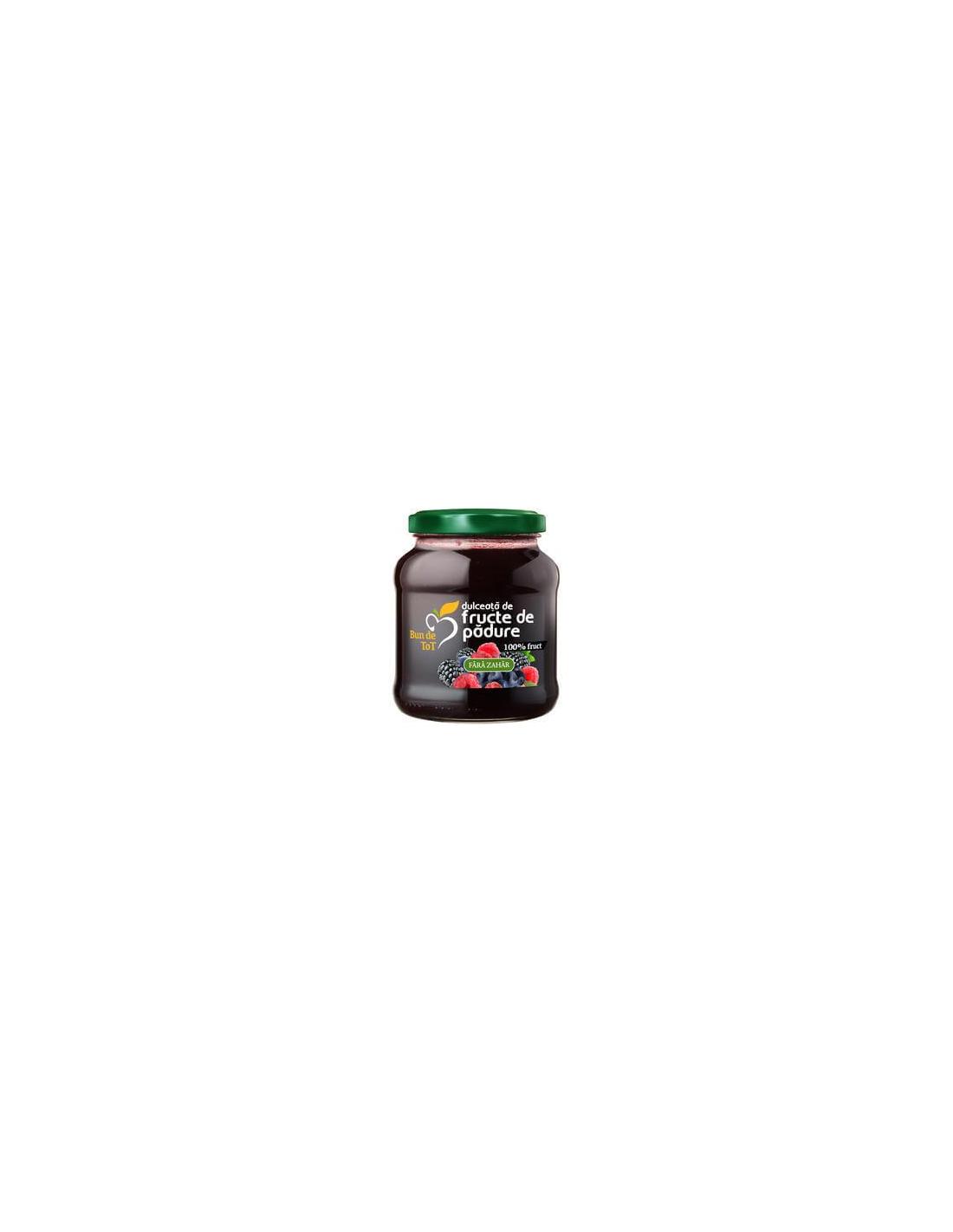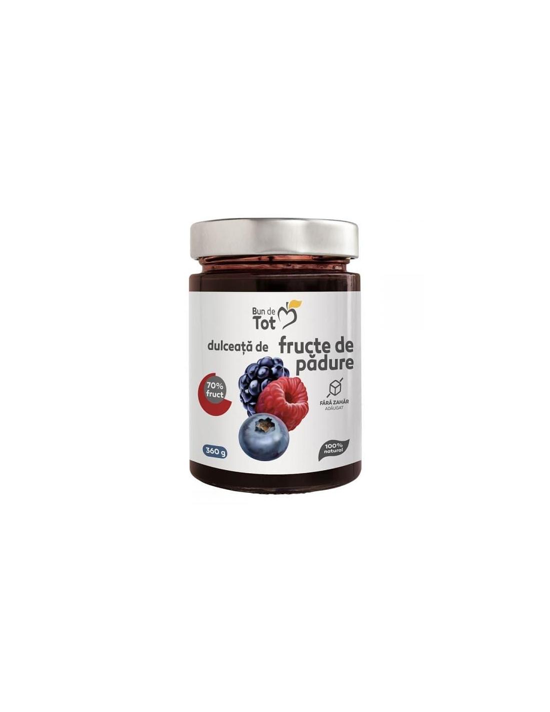 Dulceata de Fructe de Padure, 360gr, Dacia Plant - fara zahar Bun de Tot readuce la viata reteta veritabila. Contine ingrediente 100% naturale si readuce pe papilele gustative ale consumatorului savoarea autentica si inconfundabila a fructelor de padure. Intr-o cantitate de 100 de grame a produsului nostru se regasesc 70 de grame de fruct. Atunci cand sunteti in cautarea unei gustari usoare intre mesele principale, un desert delicios sau un mic dejun sanatos, dulceata de fructe de padure Bun de Tot e exact ceea ce aveti nevoie.