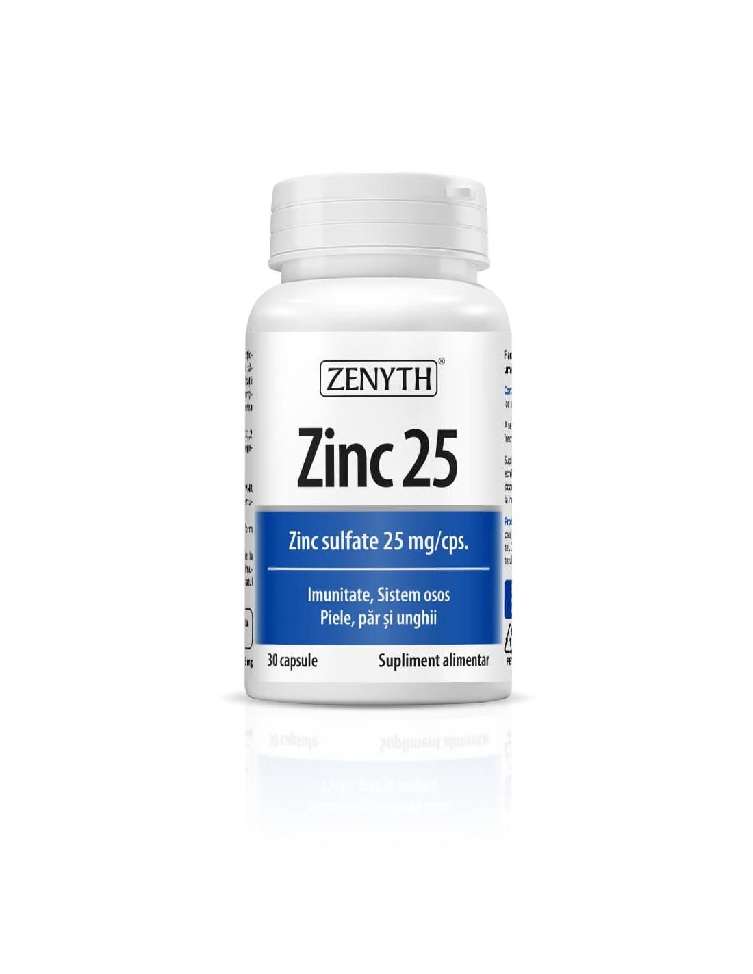 Zinc 25 este un supliment aliment sub formă de capsule cu sulfat de zinc ce contribuie la menținerea sănătății sistemului osos, la funcția cognitivă normală, la menținerea fertilității și reproducerii normale, la menținerea concentrațiilor normale de testosteron în sânge.