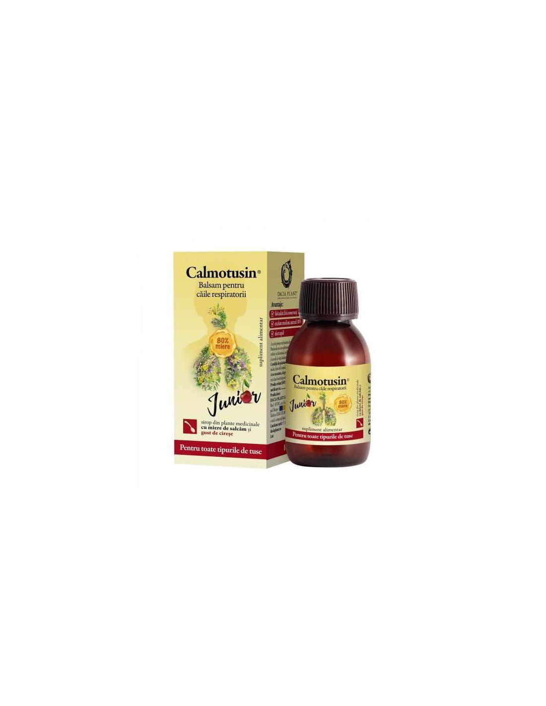 Calmotusin Junior, Sirop cirese, 100 ml, Dacia Plant este un produs natural conceput special pentru copii pentru sustinerea respiratiei. Realizat pe baza de miere de salcam, siropul Calmotusin junior are efect expectorant si antiinflamator.