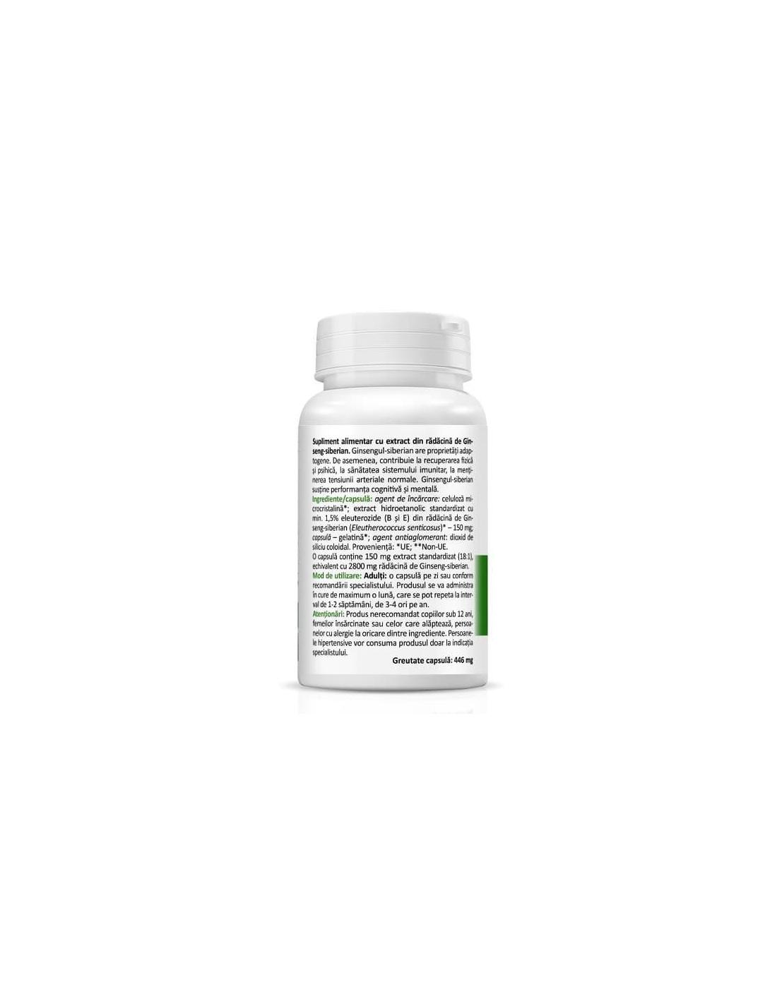 O capsulă conține 150 mg extract standardizat (18:1), echivalent cu 2800 mg rădăcină de Ginseng siberian.