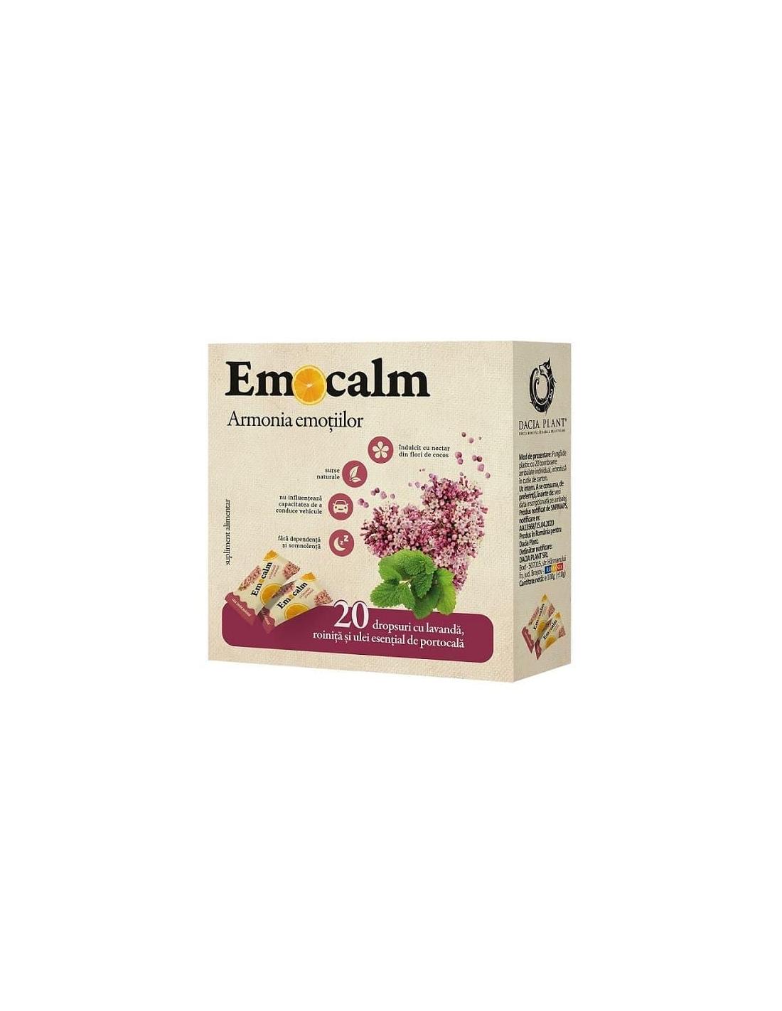 Supliment alimentar Emocalm drops, 20 dropsuri, Dacia Plant are o compozitie bazata pe uleiuri esentiale cu efect calmant in starile de neliniste, iritabilitate si stres.